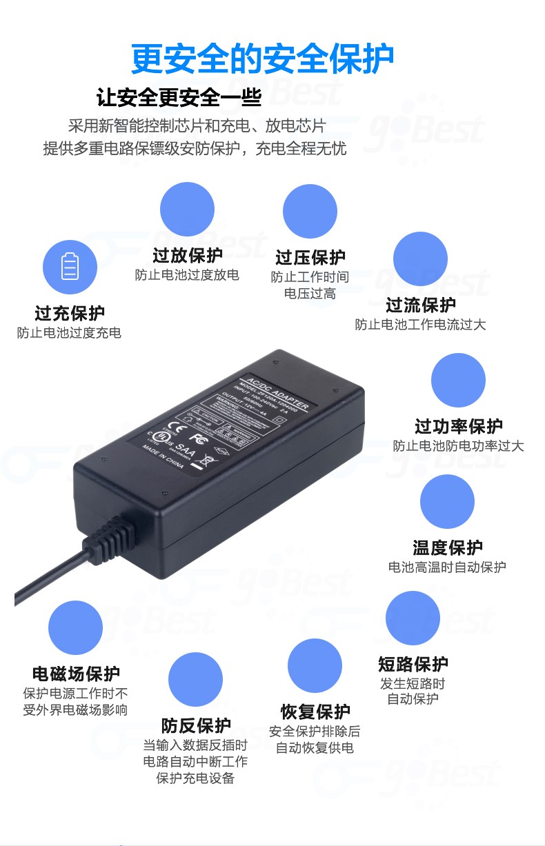 • 采用前沿IC控制方案和先進的制造工藝,高精度,低噪音;過壓,過流,過充,短路等多重保護。